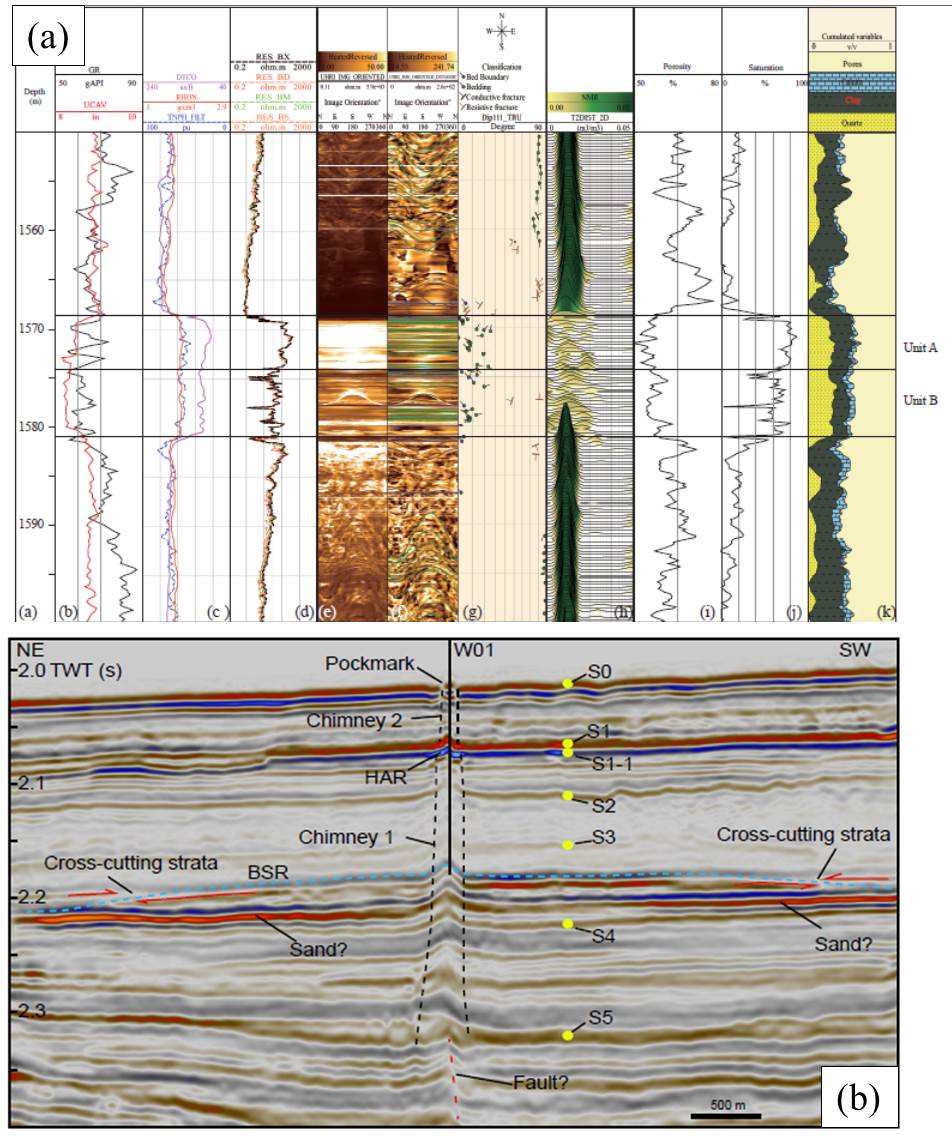 圖1. (a)W01站位測井數據。 圖中方框(Unit A和B)為富含水合物的砂層,砂層上下泥巖層中發(fā)育高角度裂隙,砂層中未發(fā)現垂向裂隙。(b)過W01地震剖面。 S1和S1-1分別為砂層的頂界面和底界面,砂層上下分別發(fā)育兩個氣煙囪。