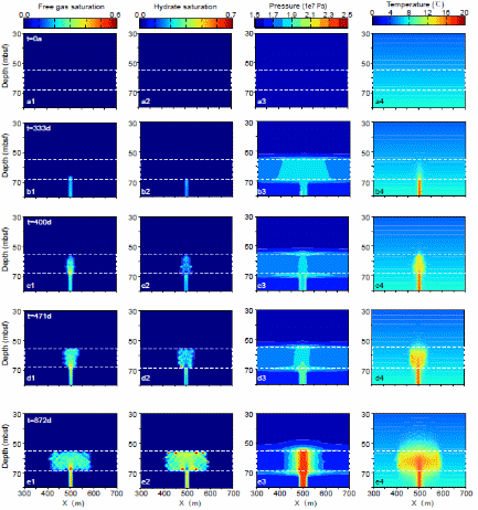 該研究還表明上覆泥層中二次水力壓裂的發(fā)生,須具備特定的超壓與氣體供給條件(圖3)。當較低的甲烷通量在進入砂層后迅速形成天然氣水合物,導致孔隙堵塞、滲透率降低,從而引發(fā)自封閉效應。該過程抑制了氣體向上部的輸運,致使砂層頂界孔隙壓力無法有效累積至破裂壓力臨界值。這一機制很好地解釋了實際地質現象:盡管部分砂層下伏氣煙囪結構發(fā)育,但其對應上覆地層中并未形成貫穿至海底的氣體逸出路徑。原因在于低通量條件下氣體運移路徑被天然氣水合物阻斷,超壓體系未能充分發(fā)育,達不到泥巖破裂所需的最小壓力條件。